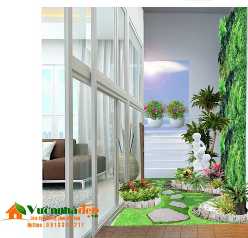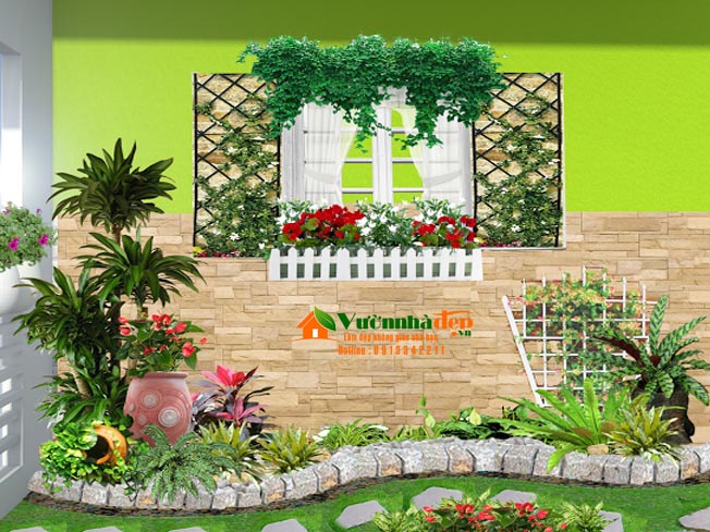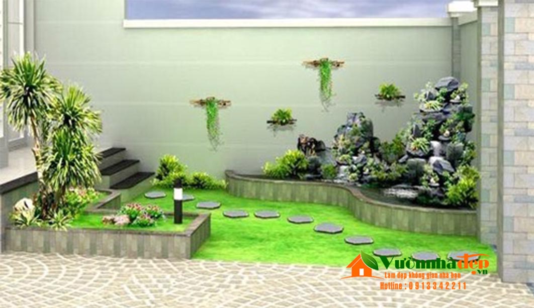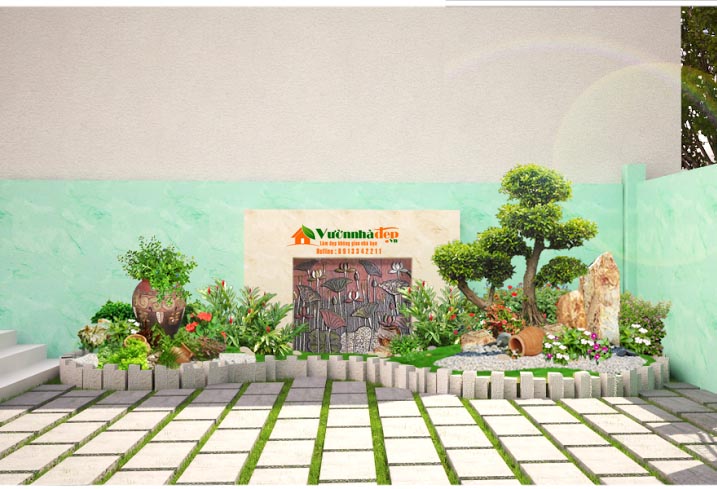 Mẫu sân vườn tiểu cảnh kết hợp tường cây ( mẫu 16)