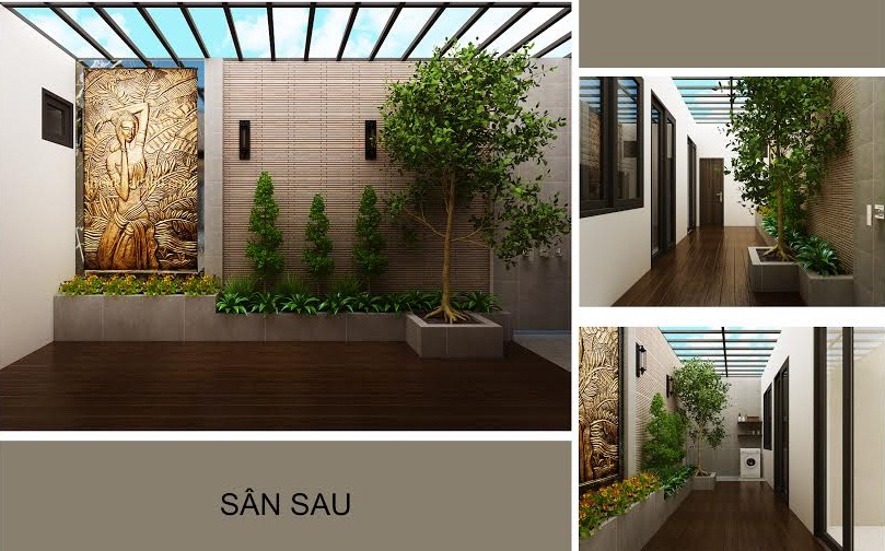 + Xây bồn hoa, bục ngồi, ốp gỗ.