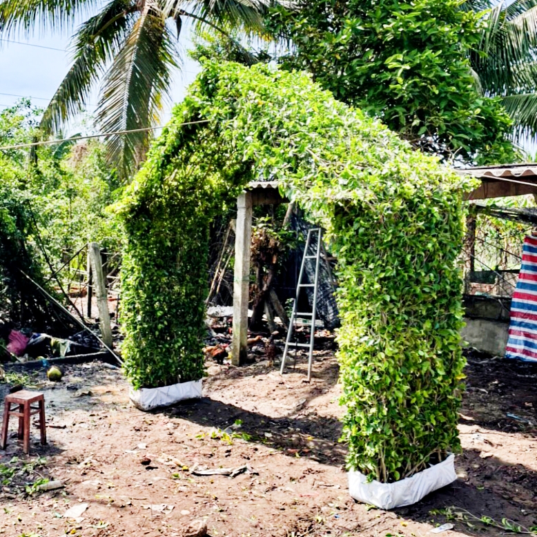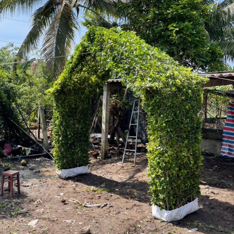 Cổng nhà cây xanh gồm 2 trụ cột 2 bên có thể tháo ráp lên xe dễ dàng, khu tới vị trí thiết kế thì đặt xuống trồng trực tiếp xuống đất.