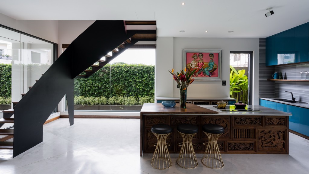 - Trên quỹ đất không quá rộng, nhiều chức năng như hồ bơi, xông hơi, vườn, deck nghỉ ngoài trời vẫn được bố trí đầy đủ. Hồ bơi ngay phía trước và bên hông nhà được kết nối vào bên trong qua hai khung cửa kính lớn: một mở ra từ phòng khách và một từ cụm bếp – quầy bar – bàn ăn. Toàn bộ không gian tầng trệt được để mở, bố trí thuận tiện cho sinh hoạt khi đông người và các bữa tiệc.