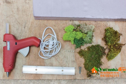 Bước 3 :Dùng súng bắn keo để cố định các loại rêu vào vách gỗ. Sau đó hoàn thiện sẽ được gắn vào tường bằng máy khoan.