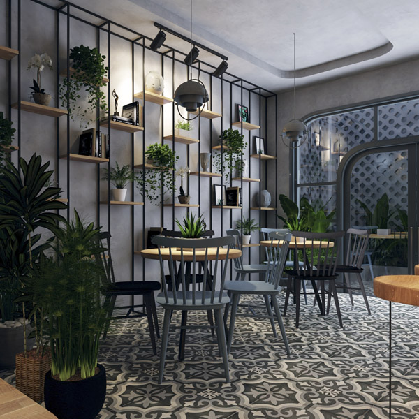 Thiết kế khu trong nhà cho quán cà phê sân vườn đơn giản