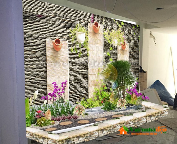 Tiểu cảnh dưới gầm cầu thang thường được dựa theo tường nhà do đó bạn nên chú ý trang trí cả cho bức tường. Để tạo sự hài hòa với các yếu tố tự nhiên trong tiểu cảnh, nên trang trí bức tường bằng đá tự nhiên.