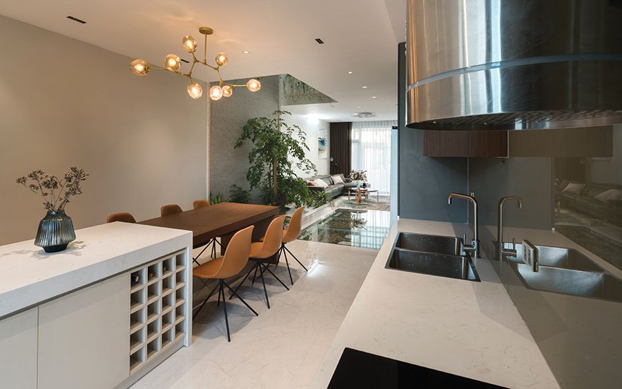 - Thiết bị, vật dụng phục vụ cho tính công năng cũng được khéo léo sắp đặt đầy đủ và bố trí rất gọn gàng. Các hệ tủ đều được thiết kế âm tường và cao chạm trần như được “giấu” đi để không gian và đồ nội thất tự thân trở thành một bộ phận cấu thành vẻ đẹp của tổng thể ngôi nhà.
