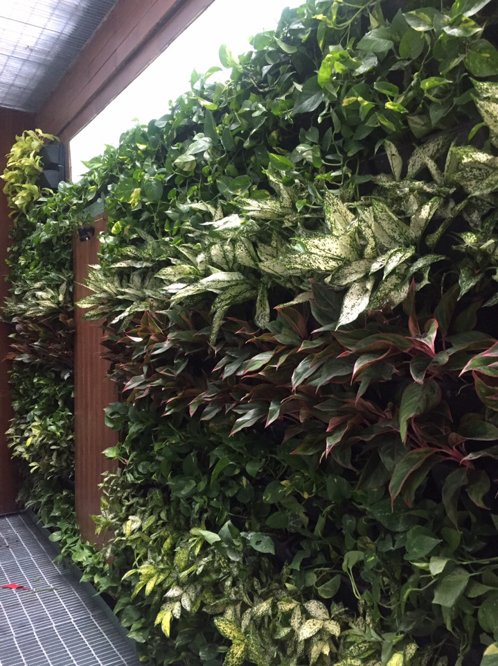 - Hệ thống hộp nhựa : 12 khung và 36 chậu cây. Các hộp trồng cây chuyên dụng này được lắp đặt lên những hệ khung sắt đã được gia cố trên mảng tường.